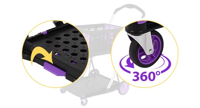 - Duable material & quiet design:The main frame of the folding cart is made of aluminum alloy, which ensures its stability. The flat plate and basket are made of PP, which reduces the weight of the whole cart while ensuring durability. The wheels are covered with TPR, making the shopping cart very quiet to move.